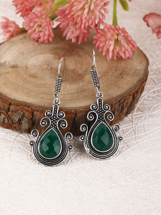 Elegant Oxidized Silver Hoop Earrings with Green Teardrop Stone